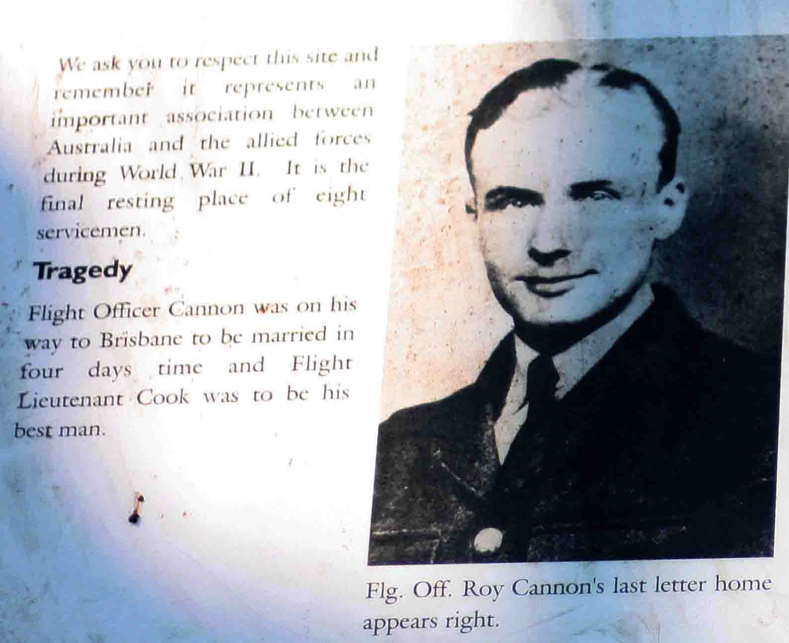 Officer Roy Cannon was to marry his Australian sweetheart Daphne. As I stood reading this plaque with sadness ' I wondered about Daphne & hoped that though it all & with terrible heartache & unbelievable grief, That in time somehow some where she manged to have a nice life.....